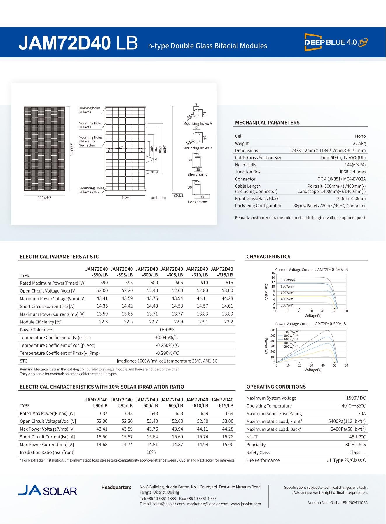 JA Solar tipo N bifacial JAM72D42/LB 605 W, 610 W, 615 W, 620 W, 625 W, 630 W