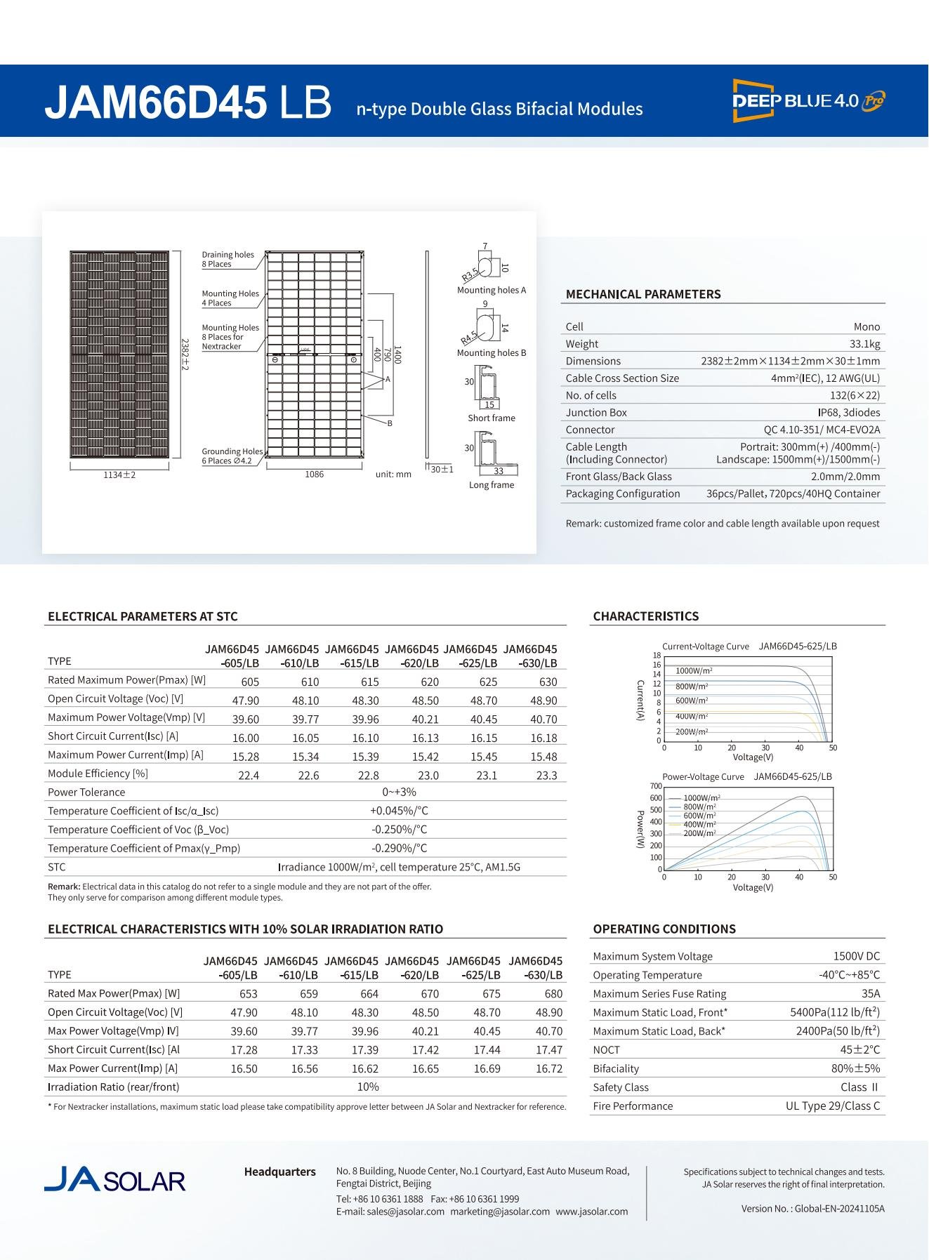 JA Solar tipo N doble vidrio bifacial JAM66D45LB 605 W, 610 W, 615 W, 620 W, 625 W, 630 W