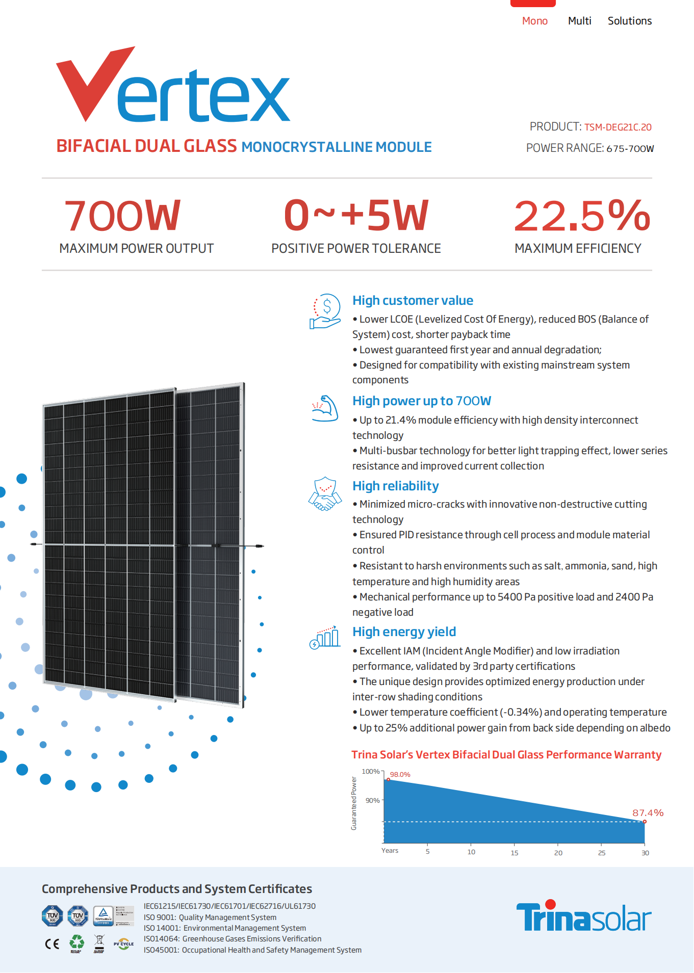Basado en una oblea de silicio de gran tamaño de 210 mm y una célula PERC monocristalina, Vertex cuenta con varias características de diseño innovadoras que permiten una alta potencia de salida de más de 600 W. Su excelente coeficiente de temperatura y su bajo rendimiento de irradiación proporcionan una mayor potencia. Además, gracias a las células mono cuadradas y a la tecnología de encapsulación de alta densidad, la eficiencia de Vertex puede alcanzar hasta 21,41 TP3T.