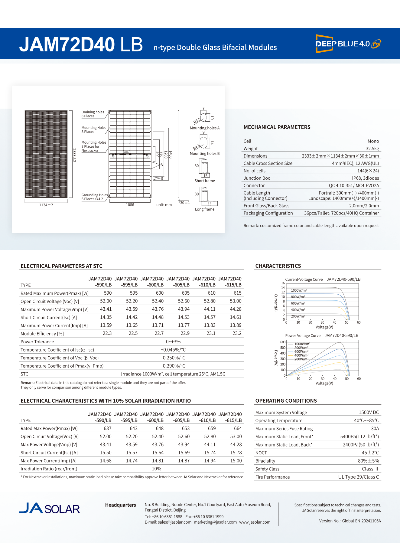JA Solar N-type Double Glass Bifacial JAM66D45LB 605w,610w,615w,620w,625w,630w